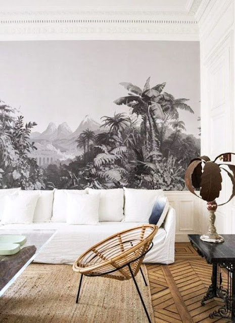 Pattern recognition. Love the mix of grand architecture, a trompe l'oeil wall and easy going furniture in this Paris apartment. See more of it here.